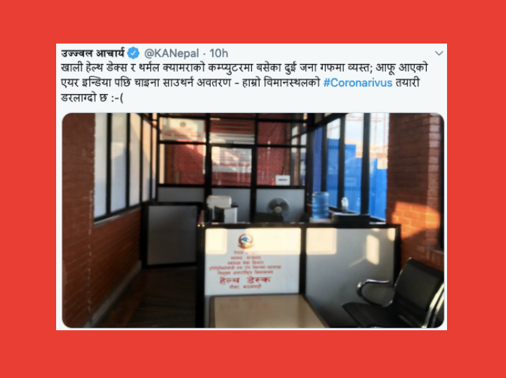 यति बेला सामाजिक संजालमा त्रिभुवन अन्तरराष्ट्रिय विमानस्थलमा सञ्चालन गरिएको स्वास्थ्यकक्षको एक तस्विर भाइरल भएको छ। जसलाई ट्वीटरमा उज्ज्वल आचार्यले पोस्ट गरेका थिए। कुनै पनि कर्मचारी नभएको उक्त हेल्थ डेक्सको तस्विर पोस्ट गर्दै आचार्यले आफू एयर इन्डियाको विमानबाट आएको र केहि समयमै चीनबाट आएको विमान अवतरण हुँदा गरेको जानकारी गराएका थिए।