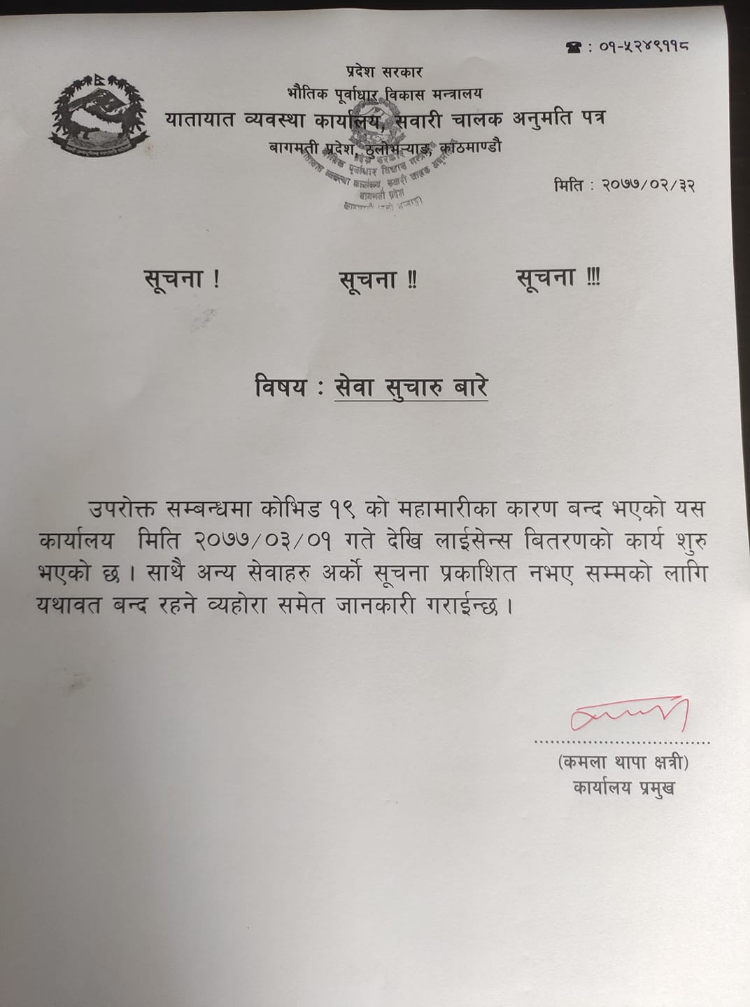 “कोभिड १९ को महामारीका कारण बन्द भएको यस कार्यालय मिति २०७७/०३/०१ गते देखि लाईसेन्स बितरणको कार्य सुरु भएको छ । साथै अन्य सेवाहरु अर्को सूचना प्रकाशित नभए सम्मको लागि यथावत बन्द रहने व्यहोरा समेत जानकारी गराईन्छ ।”,एक सूचना जारी गर्दै उनले भनेका छन्।