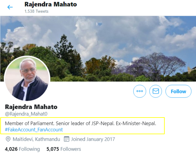 @Rajendra_Mahat0 ह्यान्डल भएको ट्वीटर मार्फत भएको ट्वीट समेत समाचारहरुमा राखिएको पाइएको छ। राजेन्द्र महत्वलाई थप भाइरल बनाइरहेको उक्त ट्वीटर ह्यान्डल वास्तविकमा भने फेक हो। उक्त ट्वीटर अकाउन्टमै ‘फेक अकाउन्ट’ भन्ने उल्लेख गरिएको छ। तैपनि, उक्त अकाउन्टलाई राजेन्द्र महत्वकै आधिकारी ह्यान्डलको दर्जा दिएर समाचारहरु सम्प्रेषित भइरहेका छन्।