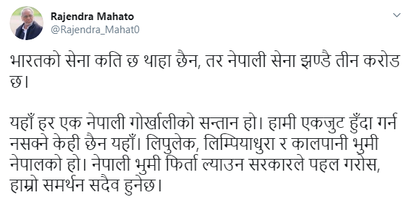 महतोले मन्तव्य दिएको केहि दिन बितिसकेपनि उनको चर्चा सामाजिक संजालमा अझै सेलाएको छैन। उनी बारे विभिन्न समाचार आउने क्रम जारी नै छ। सामाजिक संजालमा उनीसँग सम्बन्धित एक समाचार भाइरल छ। भाइरल समाचारमा महतोले “भारतको सेना कति छन थाहा छैन, नेपाली सेना तीन करोड छौं” भन्ने अभिव्यक्ति दिएको उल्लेख गरिएको छ।