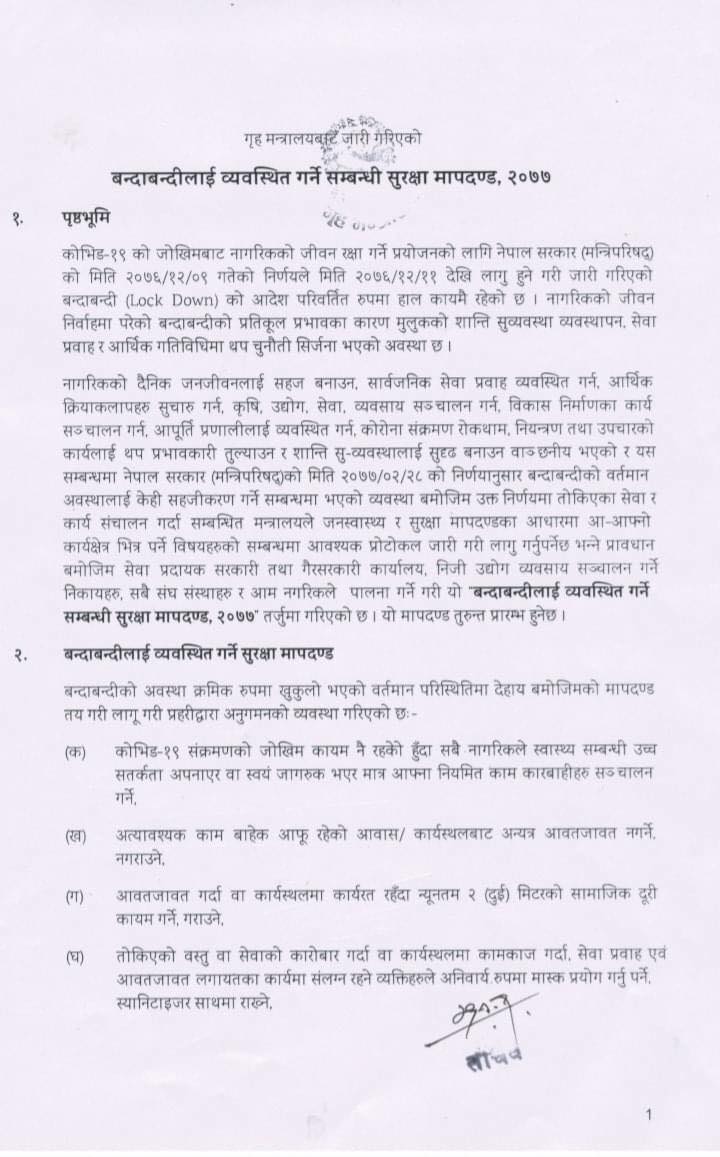 गृह मन्त्रालयले बन्दाबन्दीलाई व्यवस्थित गर्नेसम्बन्धी मापदण्ड २०७७ जारी गर्दै अत्यावश्यक कामबाहेक राति १० बजेदेखि विहान ५ बजेसम्म हिँडडुलमा रोक लगाएको छ । लकडाउन खुकुलो भएसँगै सुरक्षा सतर्कता अपनाउनको लागि गृह मन्त्रालयले नयाँ मापदण्ड तयार पारेको हो।