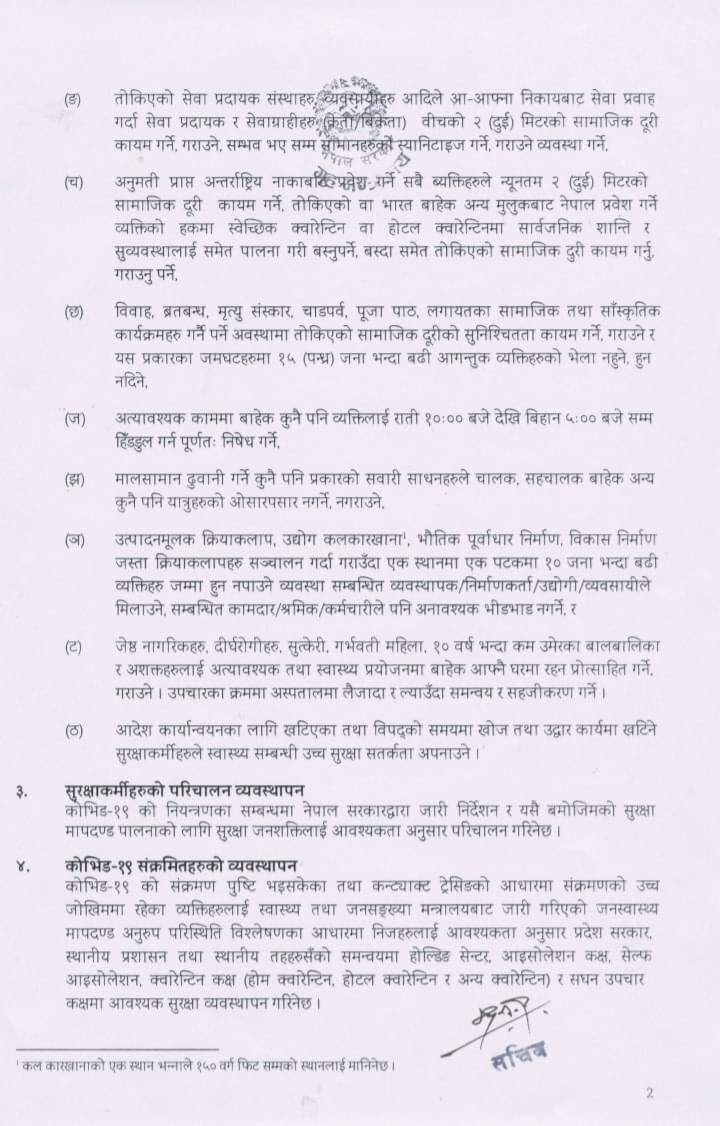 “आवतजावत गर्दा वा कार्यस्थलमा कार्यरत रहँदा न्यूनतम दुई मिटरको सामाजिक दूरी कायम गर्ने,गराउने र तोकिएको वस्तु वा सेवाको कारोबार गर्दा वा कार्यस्थलमा कामकाज गर्दा सेवा प्रवाह एवं आवतजावत लगायतका कार्यमा संलग्न रहने व्यक्तिहरूले अनिवार्य मास्क प्रयोग गर्नुपर्ने,स्यानिटाइजर साथमा राख्ने। समान ढुवानी गर्ने कुनै पनि प्रकारको सवारी साधनहरूले चालक,सहचालकबाहेक अन्य कुनै पनि यात्रुहरूको ओसारपसार नगर्नेनगराउने।”,ग्रह