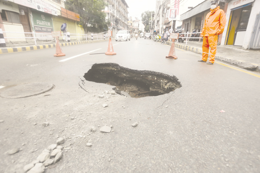 काठमाडौँ – काठमाडौँको मध्य बानेश्वरको मुख्य सडक भासिएको छ । लगातार वर्षा भइरहेकाबीच मध्य बानेश्वरको मुख्य सडक प्वाल परेको हो।