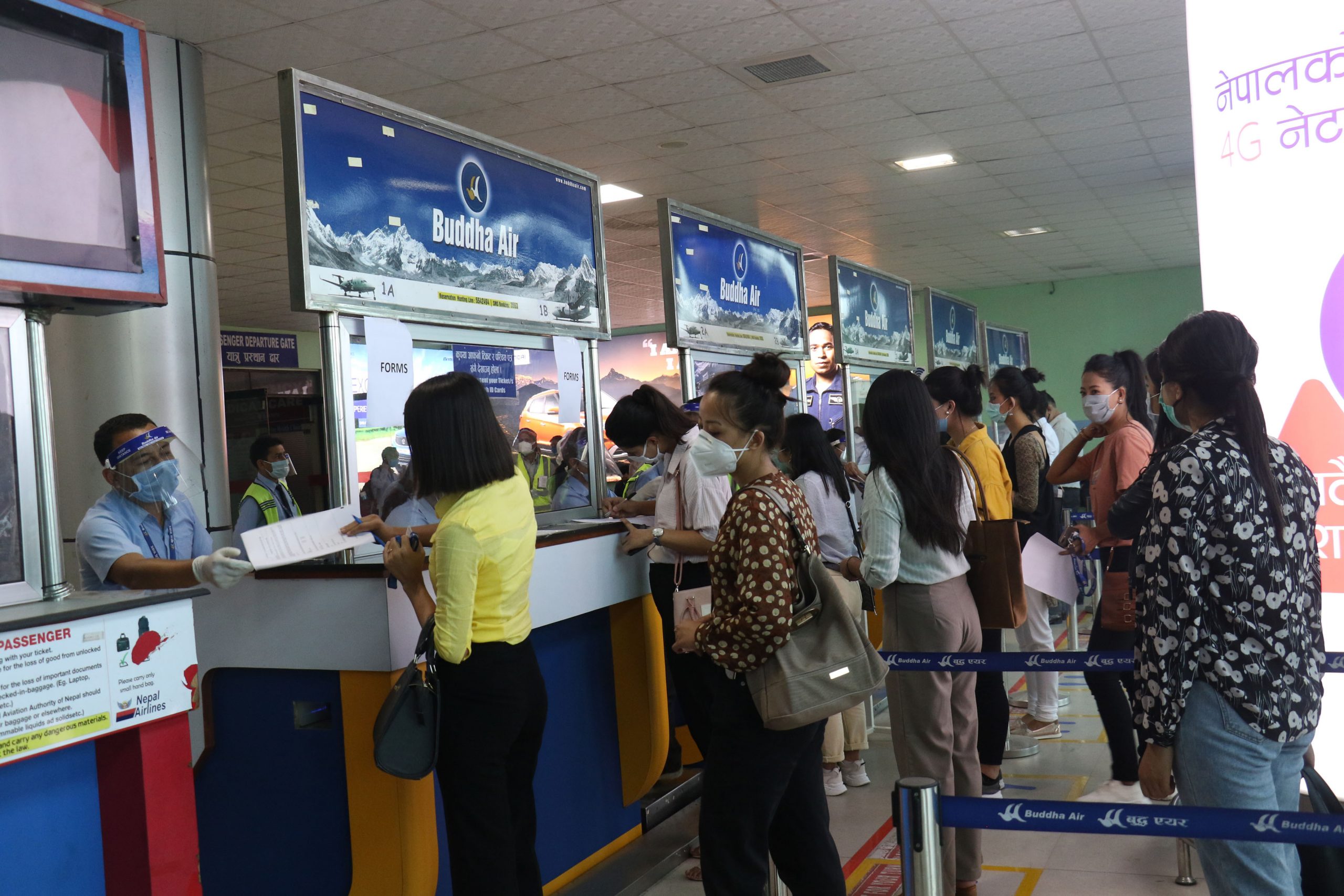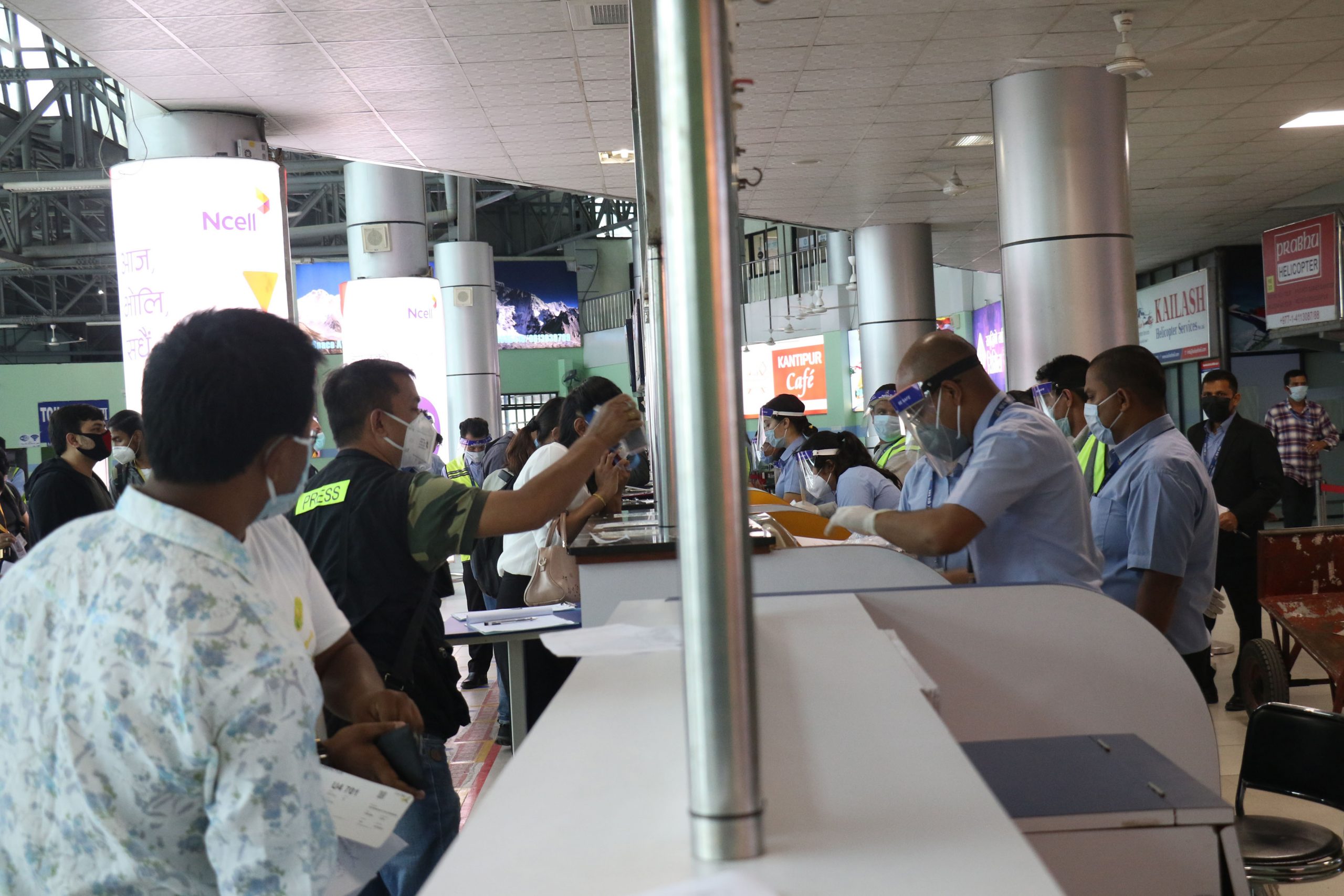 यात्रुले शुरुमा टर्मिनल भवन छिर्नासात् दुरी कायम गर्न बनाइएको घेराभित्र उभिएर लाइनबसी ज्वरो नाप्छन् । त्यसपछि सुरक्षापासको प्रक्रिया सकिन्छ । भित्र टिकट काउन्टरमा पनि सामाजिक दुरीका साथ बोडरिङ पास दिइन्छ । त्यहाँ काउन्टरका कर्मचारीले यात्रुलाई फारम भराउँछन् र मुहारसहितको परिचयपत्र मोबाइलबाट खिच्छन् अनी त्यसलाई कम्प्युटराइज गर्छन् । पाससँगै अर्को फाराम दिन्छन् उक्त फाराम यात्रुले भरेर जहाज चडेर ओर्लने बेला एयरहोस्टेजलाई दिनुपर्छ । पास लिएर अन्तिम सुरक्षा चाँचपछि यात्रु प्रतिक्षालय हुँदै सम्बन्धित गन्तव्यको उडानका लागि ¥याम्प बसभित्र छिर्छन् ।