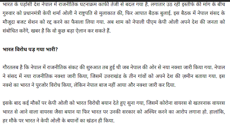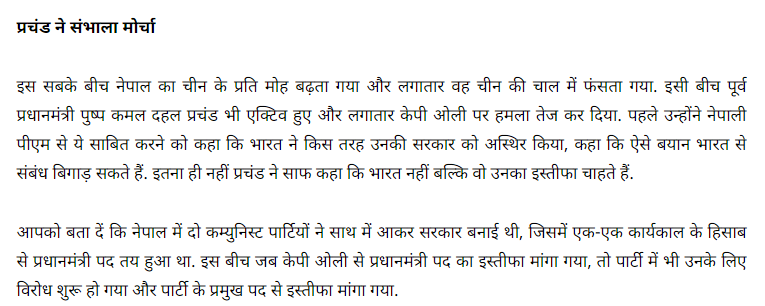 यस्तै केहि संचार माध्यमहरुले भारत विरुद्ध अनावश्यक भाषण गरेका कारण अपनी ओलीको सत्ता धर्मराएको दावी गरेका छन्। भारत विरुद्ध अनावश्यक बोलेकै कारण प्रचण्ड क्रुद्ध भएको र उनले राजिनामा मागेको उनीहरु बताउँछन्। ‘नेपाल के पीएम को भारत विरोध भारी पड़ा’ भन्दै एक भारतीय मिडियाले लेखेको समाचारमा ओलीले आज नै राजिनामा दिन लागेको भनेर दावी गरिएको छ।