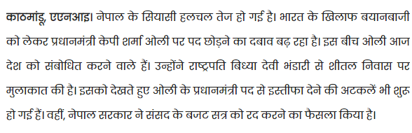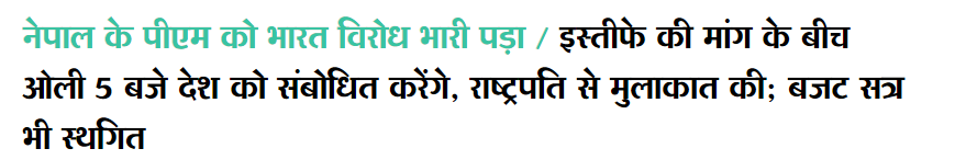 काठमाडौँ – भारतीय संचार माध्यमहरुले भारत विरुद्ध लाग्दा ओली सत्ता ध्वस्त भयो भनेर समाचार लेखेका छन्। भारतबाट प्रकाशित हुने धेरै जस्तो अनलाइन मिडियाहरुले सत्तारुढ नेपाल कम्युनिष्ट पार्टी(नेकपा) भित्रबाट ओलीको राजिनामा माग हुनुलाई भारत विरुद्ध लाग्दाको परिणाम भनेर परिभाषित गरेका छन्।