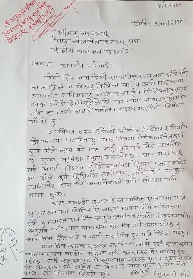 साथै निर्माता केसीले यससम्बन्धी छानविनको लागि नेपाल चलचित्र कलाकारसंघमा निवेदन समेत दिएका छन्। उनि लेख्छन्: