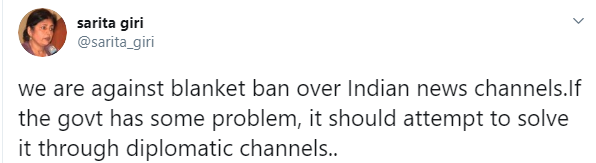 “हामी भारतीय समाचार च्यानलहरुमा कम्बल प्रतिबन्धको बिरूद्धमा छौं। यदि सरकारलाई केही समस्या छ भने उसले कुटनीतिक तवरले समाधान गर्न प्रयास गर्नुपर्छ।”,ट्वीटरमा गरीले लेखेकी छन्।
