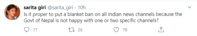 “नेपालको सरकार एकदुई अथवा केहि निश्चित च्यानलसँग खुशी छैन भन्दैमा सम्पूर्ण भारतीय च्यानल माथि प्रतिवन्ध लगाउन मिल्छ?”,गिरीले ट्वीट गर्दै भनेकी छन्।