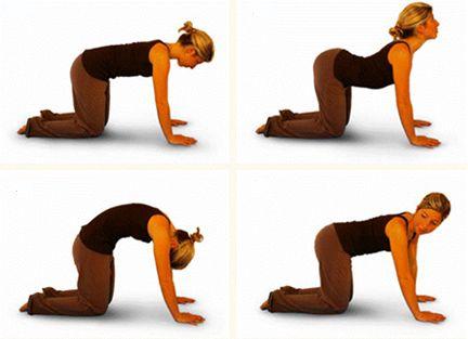 खुट्टाको सहयोगले टेबल जस्तो आकार बनाउनुहोस्। तपाईंको पीठ टेबलको माथिल्लो भाग जस्तो देखिनुपर्दछ जबकि तपाईंको हात र खुट्टा टेबलको चार खुट्टा जस्तै देखिनुपर्दछ। तपाईंको हात सिधा भुइँमा राख्नुहोस् र तपाईंको घुँडा पनि जमीनमा राख्नुहोस्। सीधा अगाडि हेर्नुहोस्। सास फेर्दा तपाईंको चिउँडो र टाउको पीठ भन्दा अलि माथि लग्नुहोस्। तपाईंको नाभी भुँइ तर्फ र तपाईंको हिप्स भित्रपट्टि पार्नुहोस्। गहिरो सास लिनुहोस् र छोटो समयको लागि यो क्याट पोज यथार्थ राख्नुहोस्। त्यसपछि, सास बाहिर निस्केर जाँदा, चिउँडो आफ्नो छातीतिर फर्केको हुनुपर्छ र आफ्नो छाती र पीठको भागलाई धनु जस्तो आकारमा सक्दो तन्काउनुहोस्। तपाईंको हिप्सलाई पहिलाको अवस्थामा ल्याउनुहोस्| टेबल-जस्तो स्थितिमा फर्कनु अघि, यो आसनलाई केहि समयको लागि कायम राख्नुहोस्। क्याट पोजबाट बाहिर निस्किनु अघि यो लगातार छ देखि आठ पटक गर्नुहोस्।
