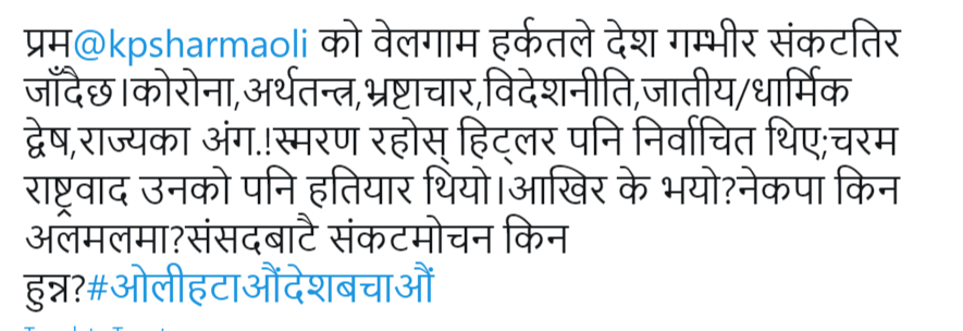 “प्रम केपी ओलीको बेलगाम हर्कतले देश गम्भीर संकटतिर जाँदैछ। कोरोना,अर्थतन्त्र,भ्रष्टाचार,विदेशनीति,जातीयधार्मिक द्वेष,राज्यका अंग!स्मरण रहोस् हिट्लर पनि निर्वाचित थिए;चरम राष्ट्रवाद उनको पनि ह-तियार थियो।आखिर के भयो?नेकपा किन अलमलमा?संसदबाटै संकटमोचन किन हुन्न?#ओलीहटाऔंदेशबचाऔं”,भट्टराईले ट्वीटरमा लेखेका छन्।