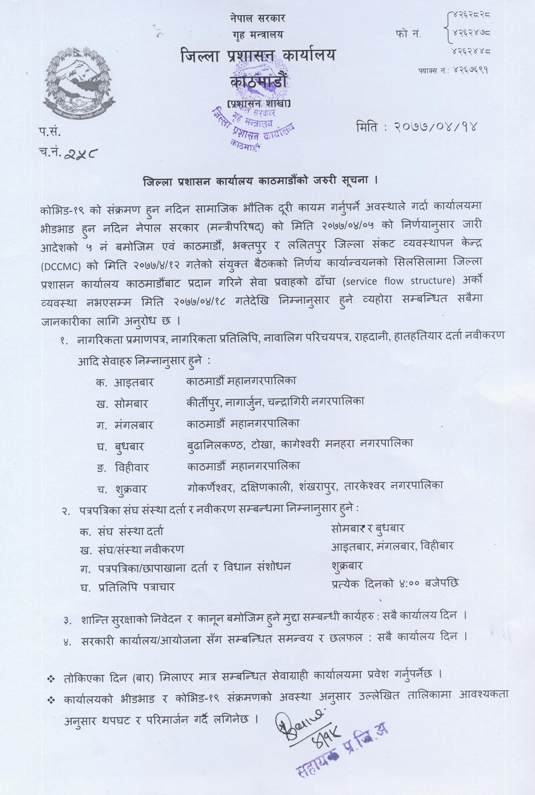 सोमबार बसेको काठमाडौँ, भक्तपुर र ललितपुर जिल्ला संकट व्यवस्थापन केन्द्रको बैठकले गरेको निर्णय अनुसार सेवा प्रवाह ढाँचा परिवर्तन गर्न लागिएको जिल्ला प्रशासन कार्यालय काठमाडौंले जनाएको छ।