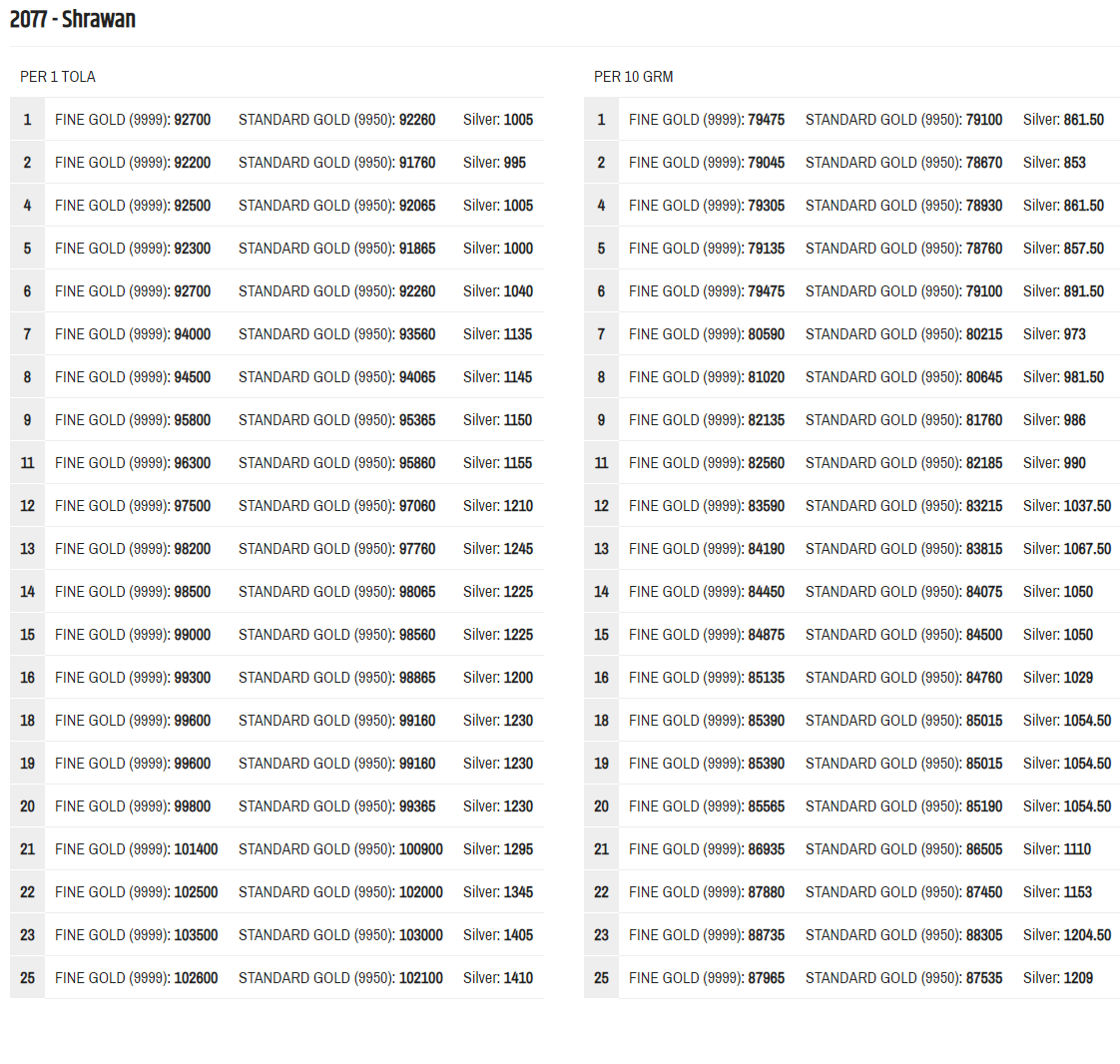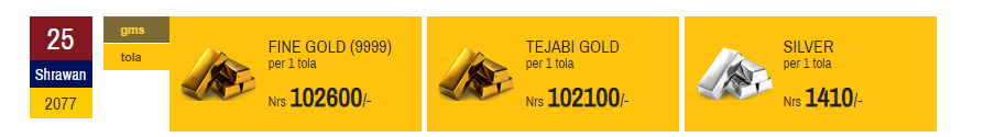 केहि महिना देखि लगातार बढिरहेको सुनको मूल्यले नयाँ-नयाँ रेकर्ड बनाउँदै आएको छ। नेपाली बजारमा सुनको मूल्य शुक्रबार हाल सम्मकै उच्च विन्दुमा पुगेको थियो। त्यस दिन सुन प्रतितोला १ लाख ३ हजार ५ सयमा करिबार भएको थियो।