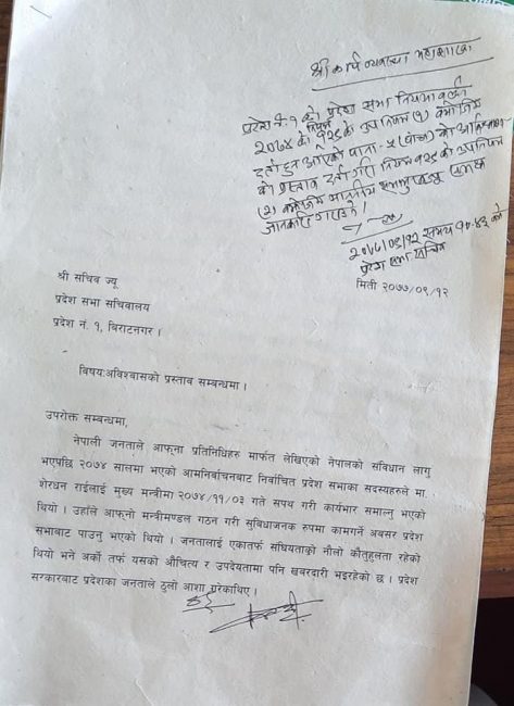 विराटनगर – प्रदेश नं १ को सरकारविरुद्ध आज अविश्वास प्रस्ताव दर्ता भएको छ ।