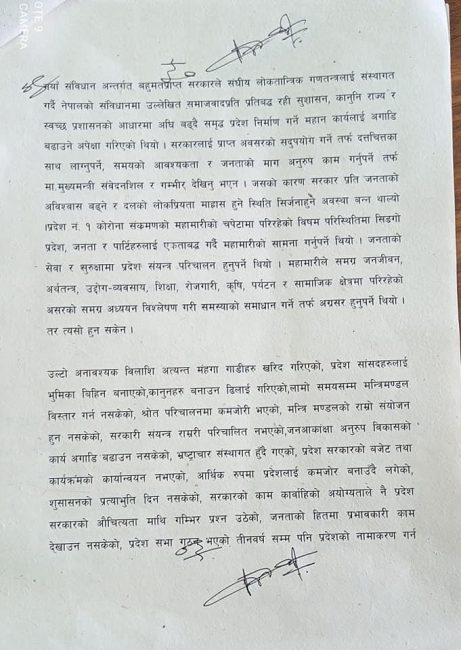 अविश्वासको प्रस्ताव पेश गर्ने प्रयोजनका लागि नेपालको संविधानको धारा १८३ को उपधारा ३ बमोजिम तत्कालै प्रदेशसभा बैठक बोलाउन पनि माग गरिएको छ ।