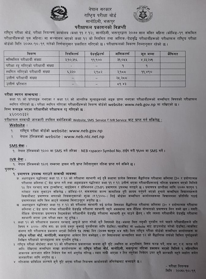 काठमाडौँ – कक्षा १२ को नतिजा आज सार्जजनिक भएको छ। सोमबार बसेको बोर्डको बैठकले कक्षा १२ को नतिजा सार्वजनिक गर्ने निर्णय गरेको हो। सार्वजनिक भएको नतिजा राष्ट्रिय परीक्षा बोर्ड र नेपाल टेलिकमको वेबसाइटमा हेर्न सकिने राष्ट्रिय परीक्षा बोर्डले जनाएको छ।
