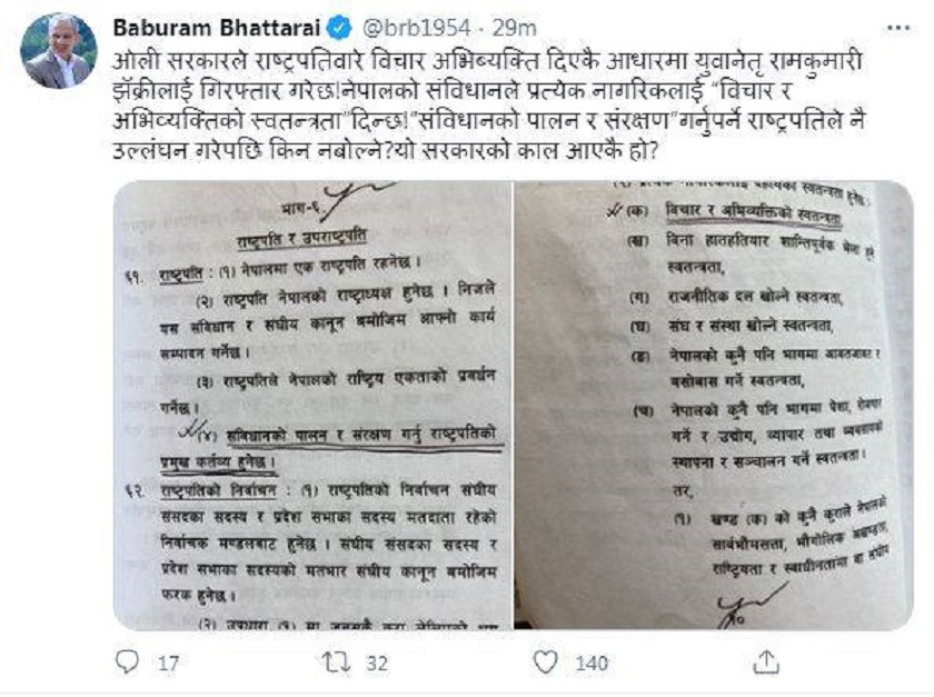 सामाजिक सञ्जाल ट्वीटरमा संविधानको धाराको फोटो सहित गरेको ट्वीटमा भट्टराईले प्रश्न गरेका छन्, “ओली सरकारले राष्ट्रपतिबारे विचार अभिव्यक्ति दिएकै आधारमा युवा नेतृ रामकुमारी झाँक्रीलाई गिरफ्तार गरेछ । नेपालको संविधानले प्रत्येक नागरिकलाई विचार र अभिव्यक्तिको स्वतन्त्रता दिन्छ । संविधानको पालन र संरक्षण गर्नुपर्ने राष्ट्रपतिले नै उल्लंघन गरेपछि किन नबोल्ने ? के सरकारको काल आएकै हो ?”