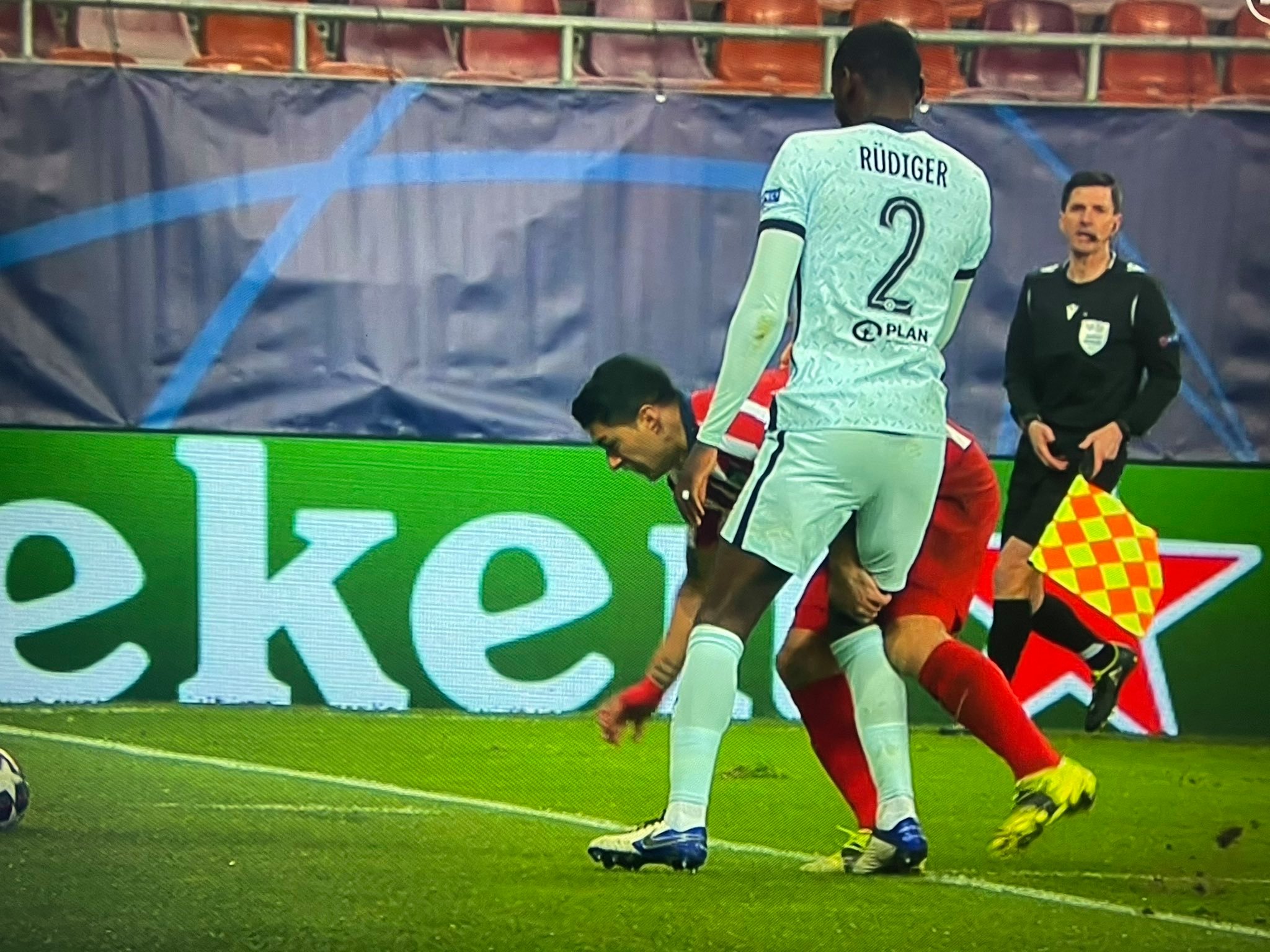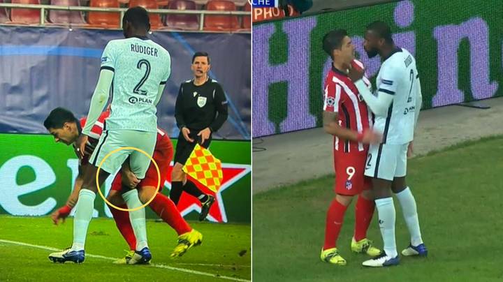 चेल्सीका जर्मन डिफेन्डर एन्टोनियो रुडीगर र सुआरेज बलका लागि संघर्ष गरिरहँदा सुआरेज लड्न पुगे । तर उनले त्यसक्रममा रुडीगरको तिघ्राको भित्री भागमा चिमोट्न भ्याए ।
