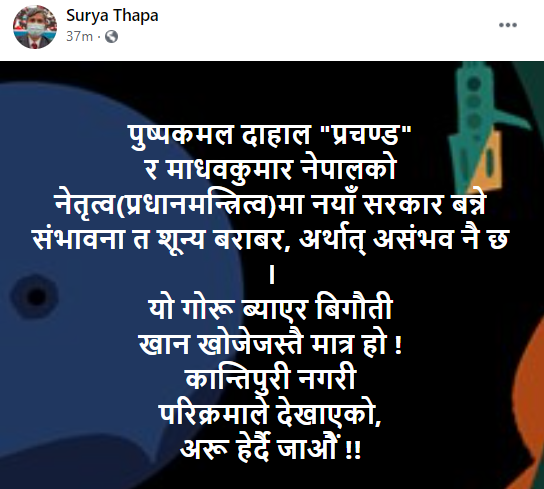 थापा फेसबुकमा लेख्छन्,”पुष्पकमल दाहाल ‘प्रचण्ड’ र माधवकुमार नेपालको नेतृत्व (प्रधानमन्त्रित्व) मा नयाँ सरकार बन्ने सम्भावना त शून्य बराबर, अर्थात् असम्भव नै छ । यो गोरु ब्याएर बिगौती खान खोजेजस्तै मात्र हो ! कान्तिपुरी नगरी परिक्रमाले देखाएको, अरु हेर्दै जाऔं !”