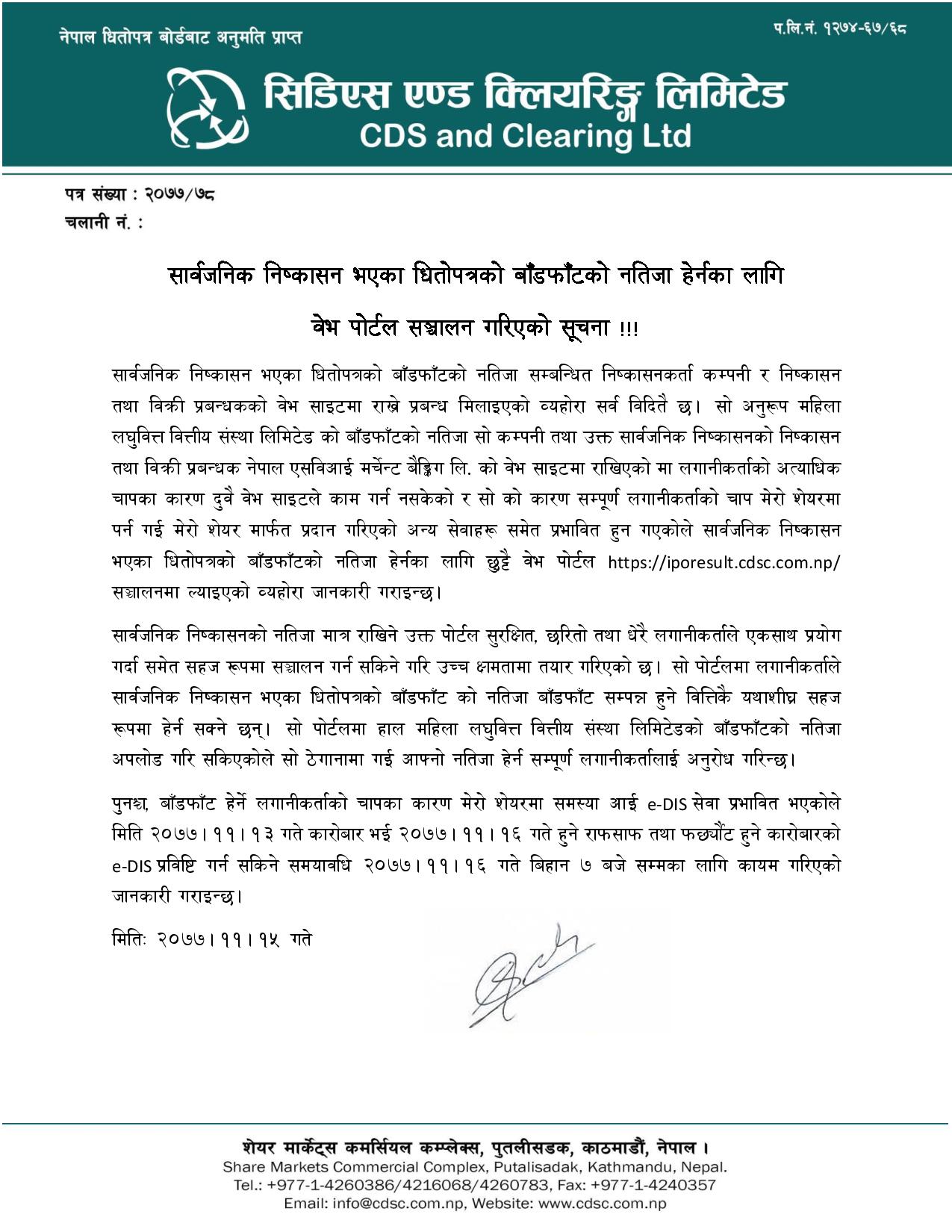 आईपीओको नतिजा हेर्नको लागि सिडिएस एण्ड क्लियरिङ लिमिटेडले नयाँ वेबसाइट सञ्चालनमा आएको छ । आईपीओको नतिजा हेर्नको लागि मेरो शेयरको वेबसाइट, सम्वद्ध कम्पनीको वेबसाइट, बिक्री प्रबन्धकको वेबसाइटबाट आइपिओको नतिजा हेर्दा चापका धान्न नसकेपछि सिडिएस एण्ड क्लियरिङ लिमिटेडले नयाँ वेबसाइट ल्याएको हो।