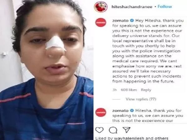 हितेशाका अनुसार डेलिभरी बोएको मुक्काको कारण उनको नाकको हड्डी भाँचिएको छ र शल्यक्रिया गर्नुपर्नेछ। उनले घटनाको बारेमा बेंगलुरु प्रहरीमा गुनासो गरेकी छिन्। जसपछि प्रहरीले डेलिभरी बोएलाई पक्राउ गरेको छ। यस मामिलाको जिम्मा लिँदै जोम्याटोले माफी पनि मागिसकेको छ र कम्पनीको स्थानीय अधिकारीले महिलासँग सम्पर्क गरेर पुलिस अनुसन्धान वा उपचारको लागि आवश्यक पर्ने सहयोग पुर्याउने भएको छ। कम्पनीले आरोपितलाई कडा कारबाही गर्नेछ। कम्पनीले मानिसलाई आश्वासन पनि दिएको छ कि भविष्यमा यस्तो घटना फेरि हुने छैन।