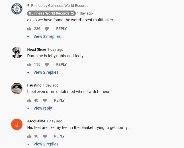 १ मिनेट ४६ सकेन्डको यो भिडियो १५ मार्चको दिन गिनीज वर्ल्ड रेकर्ड यूट्यूब च्यानलबाट साझा गरिएको थियो। यसको क्याप्शनमा लेखिएको छ, दुई हात र दुई खुट्टाले तीन रुबिक्स क्युब सल्ब। समाचार लेख्ने समय सम्ममा, भिडियोलाई १ लाख भन्दा बढीले हेरिसकेका छन् र ३ हजार भन्दा बढी लाइकहरू प्राप्त गरेको छ।