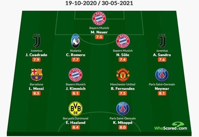 यस्तोमा हु स्कोर्डले यो सिजनको च्याम्पियन्स लिगमा अहिलेको चरणसम्म सबैभन्दा उत्कृष्ट रेटिंगको आधारमा अहिलेसम्मको ‘टिम अफ द सिजन’ सार्वजनिक गएको छ। बेस्ट ११ मा केहि ठूला खेलाडी समावेश हुन सकेका छैनन्, जस मध्ये सबैभन्दा ठूलो नाम हो: क्रिस्टियानो रोनाल्डो।