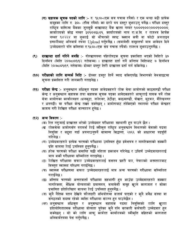 अनुसन्धान अधिकृत पदको लागि विश्वविद्यालयबाट कम्तिमा स्नातक वा सो सरहको उपाधि प्राप्त गरेको हुनुपर्छ। अनुसन्धान सहायकको लागि भने विश्वविद्यालयबाट कम्तिमा प्रविणता तह वा सो सरहको उपाधि प्राप्त गरेको हुनुपर्छ। र सहायक सूचक पदको लागि मान्यता प्राप्त शिक्षण सस्थाबाट कम्तिमा एसएलसी वा एसईई वा सो सरहको उपाधि प्राप्त गरेको हुनुपर्नेछ।