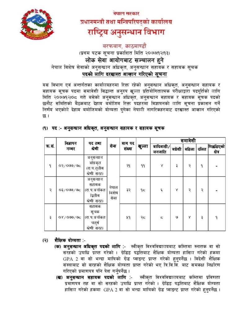 काठमाडौँ, चैत्र १३। राष्ट्रिय अनुसन्धान विभागले अनुसन्धान अधिकृत, अनुसन्धान सहायक र सहायक सूचक पदको लागि दरखास्त आह्वान गरेको छ । प्रधानमन्त्री तथा मन्त्रिपरिषद्को कार्यालय राष्ट्रिय अनुसन्धान विभागले १ सय ४ जना नागरिक विभिन्न पदका लागि माग गरेको छ।