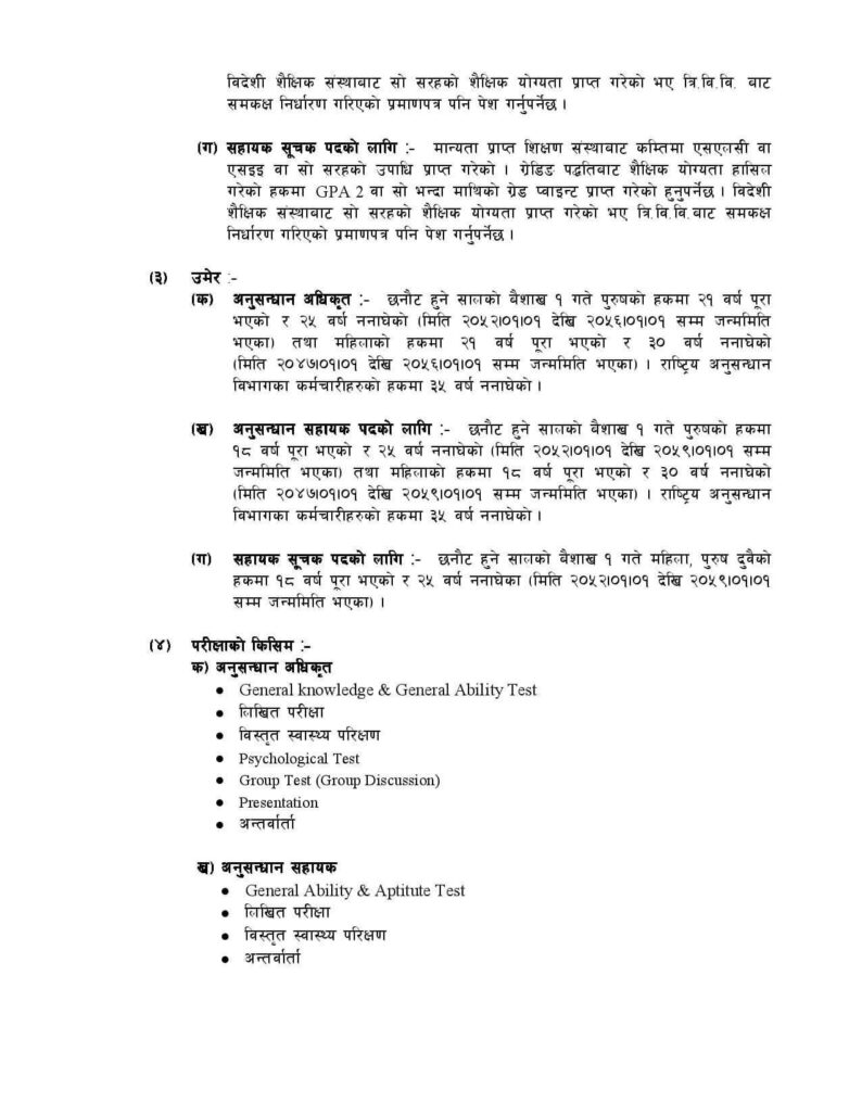 अनुसन्धान अधिकृत पदको लागि विश्वविद्यालयबाट कम्तिमा स्नातक वा सो सरहको उपाधि प्राप्त गरेको हुनुपर्छ। अनुसन्धान सहायकको लागि भने विश्वविद्यालयबाट कम्तिमा प्रविणता तह वा सो सरहको उपाधि प्राप्त गरेको हुनुपर्छ। र सहायक सूचक पदको लागि मान्यता प्राप्त शिक्षण सस्थाबाट कम्तिमा एसएलसी वा एसईई वा सो सरहको उपाधि प्राप्त गरेको हुनुपर्नेछ।