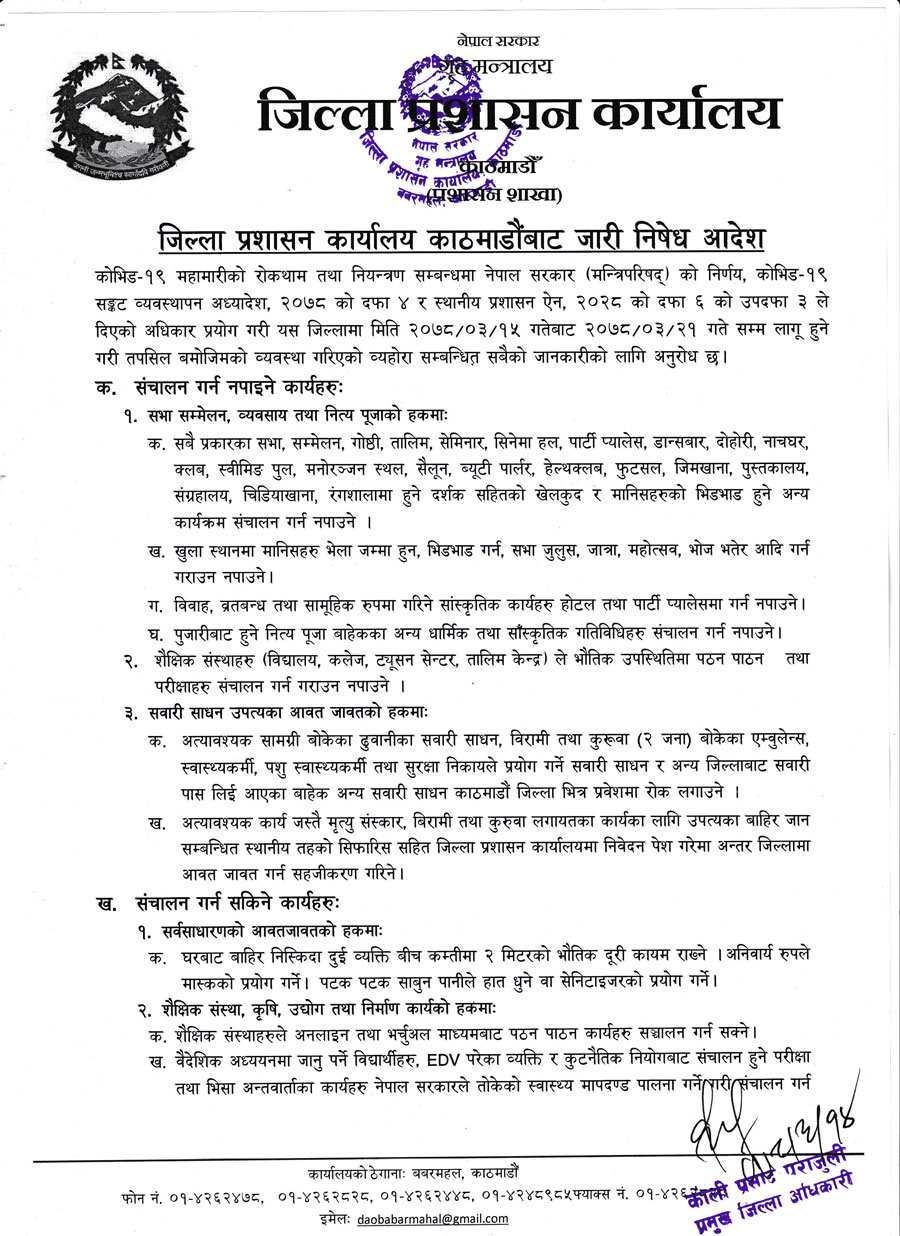 सबै प्रकारका सभा, सम्मलेन, तालिम, सेमिनार, गोष्टि, सिनेमा हाल, पार्टी प्यालेस, दोहोरि, नाचघर, स्विमिङ्ग पुल, जिमखाना ब्युटीपार्लर, सैलुनलगायत मानिसहरुको भिड हुने अन्य कार्यक्रम भने गर्न पाइने छैन।