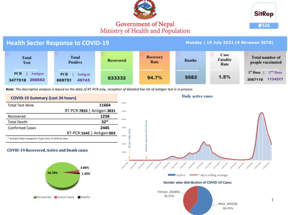त्यस्तै, पछिल्लो २४ घण्टामा देशभर जनाको कोरोना संक्रमणको कारण ३२ जनाको ज्यान गएको पुष्टि भएको छ। योसँगै हालसम्म कोरोना संक्रमणका कारण ज्यान जानेको सङ्ख्या ९ हजार ५८२ पुगेको छ।