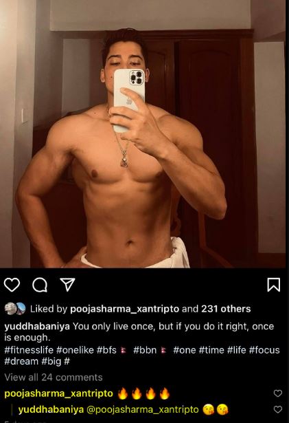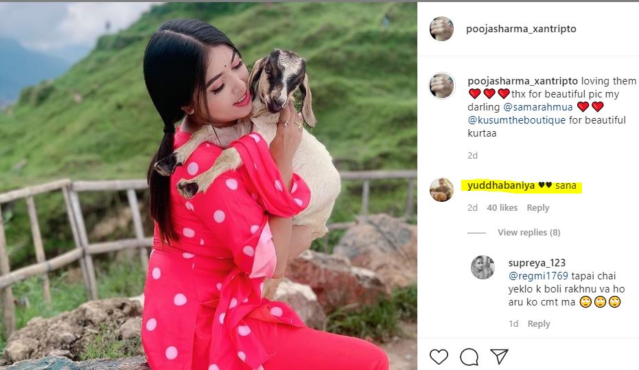 साथै उनीहरु प्रेममा रहेको कुरा सामाजिक संजालमा गरिएको कमेन्टबाट पनि स्पष्ट हुन्छ। हालै पुजा शर्माले इन्स्टाग्राममा एक तस्विर शेयर गरेकी छिन्। जसमा युद्ध बानियाले ‘साना’ भनेर प्रेम झल्काउने कमेन्ट गरेका छन्।