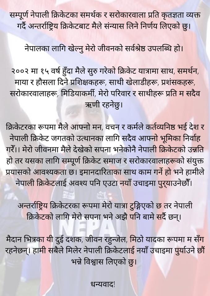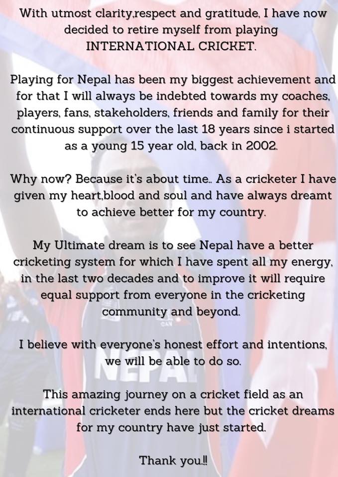 नेपाली दिग्गज क्रिकेटर पूर्व कप्तान पारस खड्काद्वारा सन्यासको घोषणा !