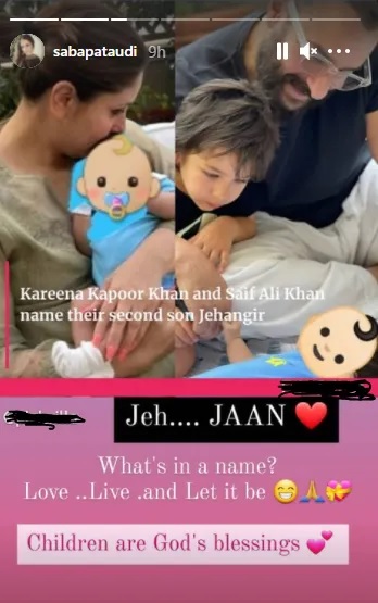 जहांगीर नामको बढ्दो विरोध देखेर सेफकी जेठी बहिनी सबा अली खानले आफ्नो प्रतिक्रिया दिएकी छिन्। सबाले इन्स्टा एकाउन्टमा एक स्टोरी शेयर गर्दै आफ्नो दाई र भाउजूको बचाव गरेकी छिन्। यस पोस्टमा, सबाले करीनाको छोराको नाम वाला स्टोरी साझा गर्दै लेखिन्,”नाममा के राखेको छ? माया दिनुहोस्, आरामले जिउनुहोस् र जिउन दिनुहोस्। बच्चा भगवानको रुप हुन्छन्।”