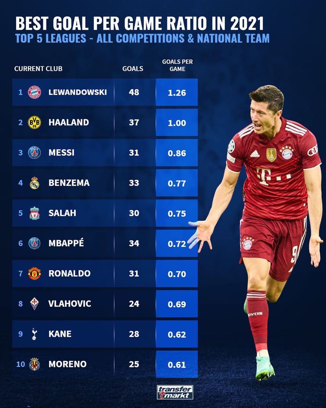 १ रोबर्ट लेवान्डोस्की (बायर्न म्युनिख र पोल्याण्ड) – ४८ गोल, १.२६ गोल-प्रति-खेल