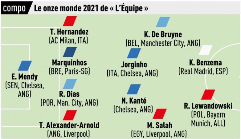 डिफेन्समा एल इक्विपले लिभरपुलका ट्रेन्ट एलेक्जेन्डर–आर्नोल्ड, पिएसजीका मर्किन्होस, म्यानचेस्टर सिटीका रुबेन डियास र एसी मिलानका हर्नान्डेजलाई राखेको छ भने गोलरक्षकमा चेल्सीका इडुवार्ड मेन्डी परेका छन्।