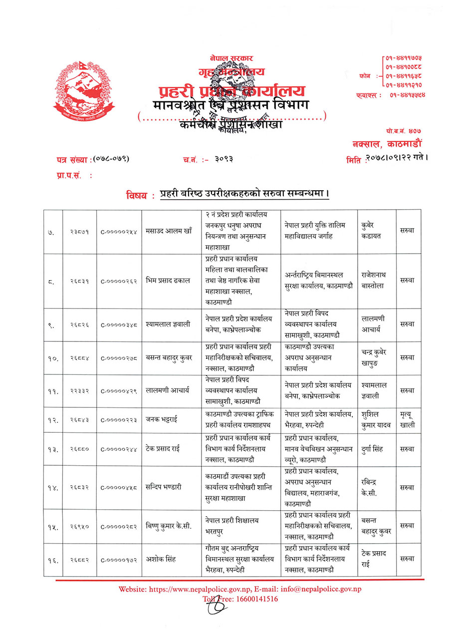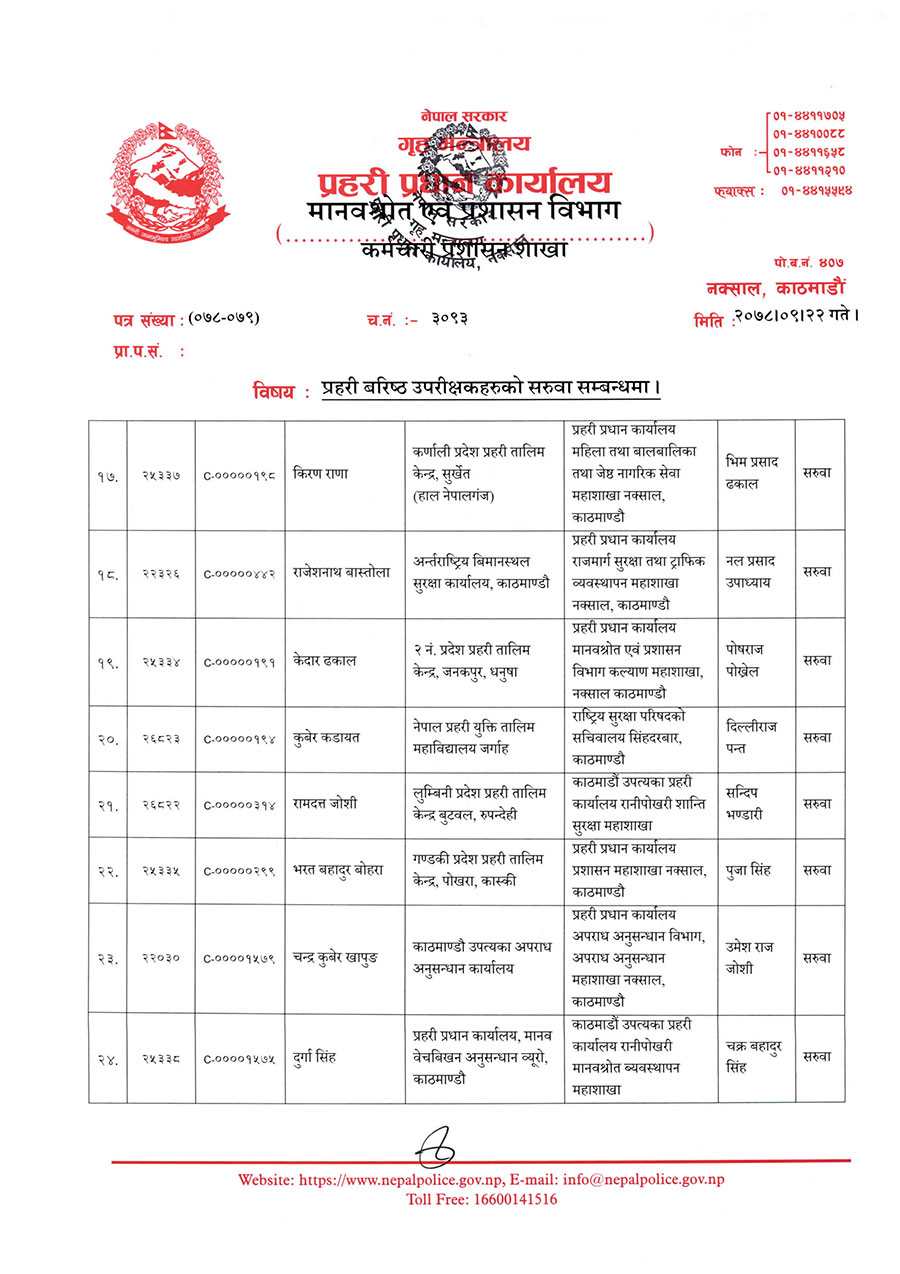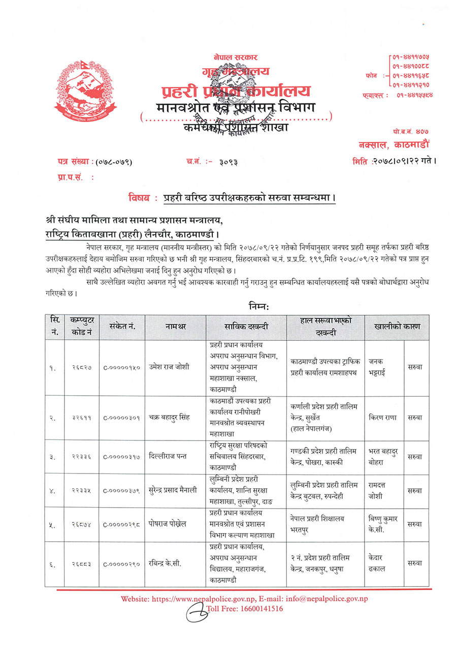 यसअघि ट्राफिक महाशाखामा कार्यरत जनक भट्टराईलाई नेपाल प्रहरी प्रदेश कार्यालय रुपन्देही र अपराध महाशाखामा कार्यरत चन्द्रकुवेर खापुङलाई अपराध अनुसन्धान महाशाखा नक्साल सरुवा गरिएको प्रहरी प्रधान कार्यालय मानव स्रोत एवं प्रशासन विभागले जनाएको छ ।