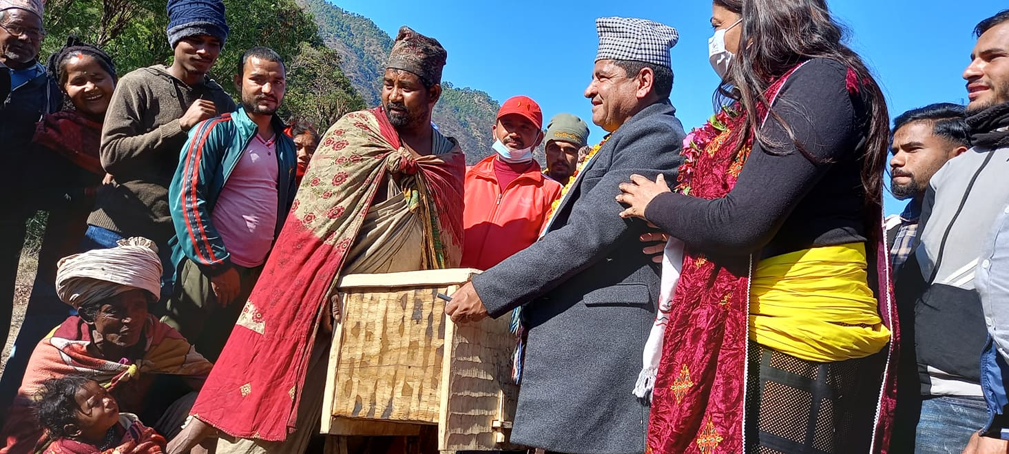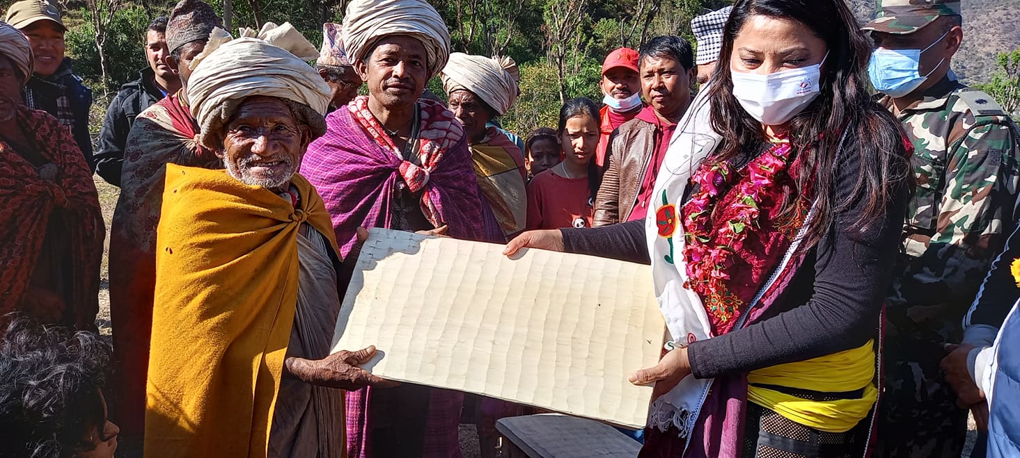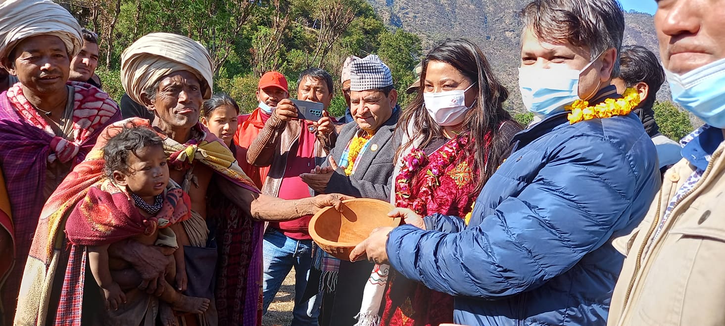 सल्यान । शुक्रबारको मध्यान्ह राउटे बस्तीमा नौलो चहलपहल थियो । सल्यानको सिम्ता गाउपालिका ४ भेरी नदी तिरमा रहेको चौरमा स्याउलाले बनाएको छाप्रो नजिकै राउटेहरुबाट घेरिएकी थिइन् शहरी विकास मन्त्री रामकुमारी झाक्री । त्यही हुलमा मिसिएकी राउटे युवती सम्झनाले लजाउँदै भनिन् ‘मीत लगाया क्या हुने हो ? त्यसपछि मन्त्री झाक्री बोलिन,‘मीत लाए माया बडछ नि ।’ त्यतिबेलासम्म अर्की राउटे युवती काजलुपनि आइन् । मन्त्रीले झोलाबाट माला झिकिन् दुबैलाई लगाइदिइन र ‘अबदेखि हामी मितिनी भयौं’ भन्दै गम्लङग अंगालो हालिन् ।