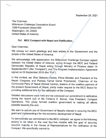 सार्वजनिक भएको पत्रमा प्रधानमन्त्री तथा नेपाली कांग्रेस सभापति शेरबहादुर देउवा र नेकपा माओवादी केन्द्रका अध्यक्ष पुष्पकमल दाहाल ‘प्रचण्ड’ले एमसीसी पास गर्ने प्रतिबद्धताका साथ हस्ताक्षर गरेको पनि खुलासा भएको छ। सेप्टेम्बर २९ मा वासिङटन डिसीस्थित एमसीसी बोर्डलाई पठाईएको पत्रमा प्रधानमन्त्री देउवा र अध्यक्ष दाहालले संयुक्त हस्ताक्षर गरेका छन्।