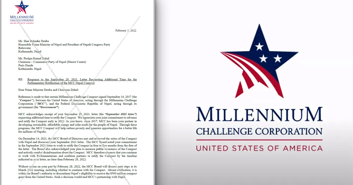 काठमाडौंः सत्ता गठबन्धन दलले अमेरिकी सहयोग परियोजना मिलेनियम च्यालेन्ज कर्पोरेसन (एमसीसी) पास गर्ने प्रतिबद्धताका साथ अमेरिकी राजधानी वासिङ्टन डिसीस्थित एमसीसी मुख्यालयलाई पठाएको गोप्य पत्र सार्वजनिक भएको छ।
