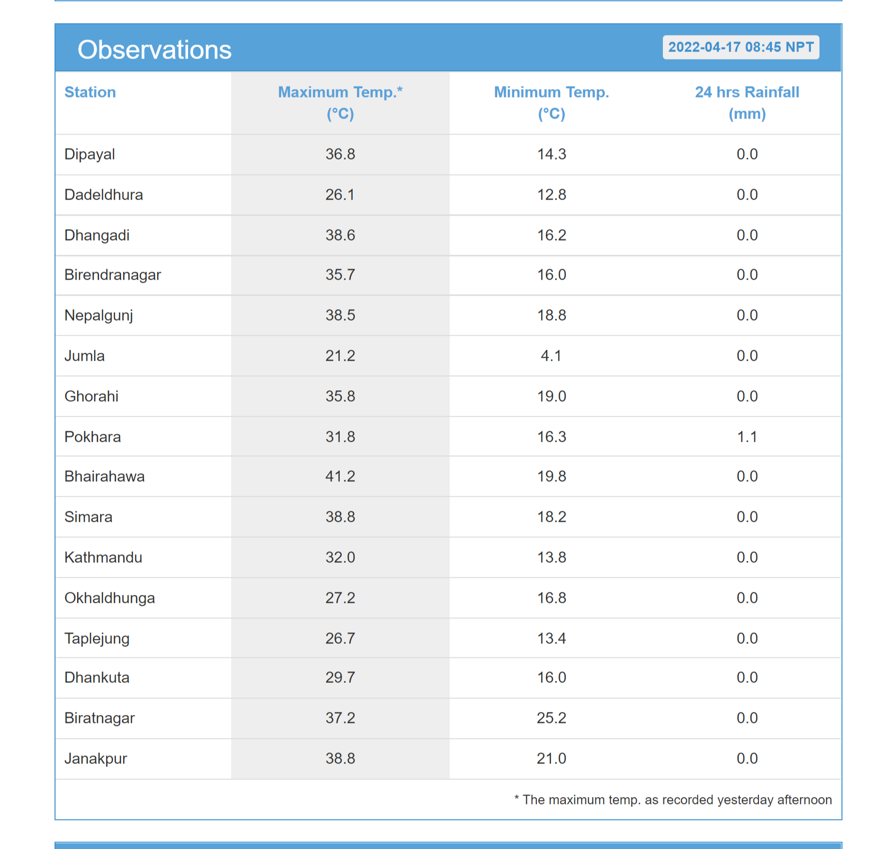 धरानको अधिकतम तापक्रम ३६ दशमलव २ डिग्री सेल्सियस, जिरीको अधिकतम तापक्रम २६ दशमलव २ डिग्री सेल्सियस पुगेको महाशाखाले जनाएको छ। देशका मूख्य शहरमा रेकर्ड भएको तापक्रमको विवरण निम्न छ।