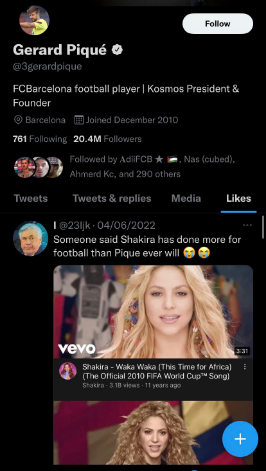 स्टार जोडीको विभाजन पछि, ट्विटर प्रयोगकर्ता @23ljk ले ४५ वर्षीय पप सुपरस्टारले अघिल्ला दुई विश्वकपका लागि गएकी दुई गीतहरूको स्क्रिनसट पोस्ट गरे, जसको क्याप्शन रहेको थियो, “कसैले भने कि शकिराले फुटबलको लागि पिके भन्दा बढी गरेकी छिन्।”